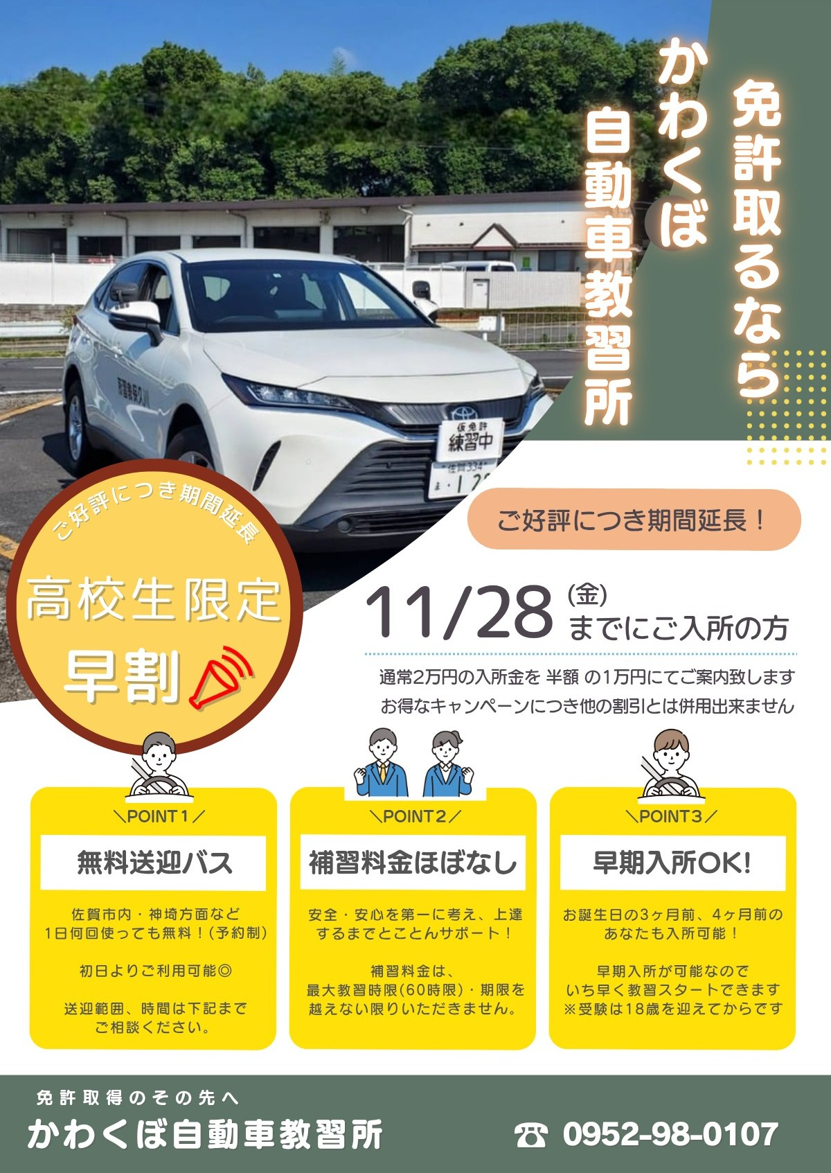 かわくぼで免許を取られた方のご家族限定で割引あり。